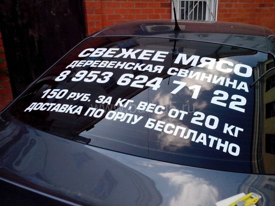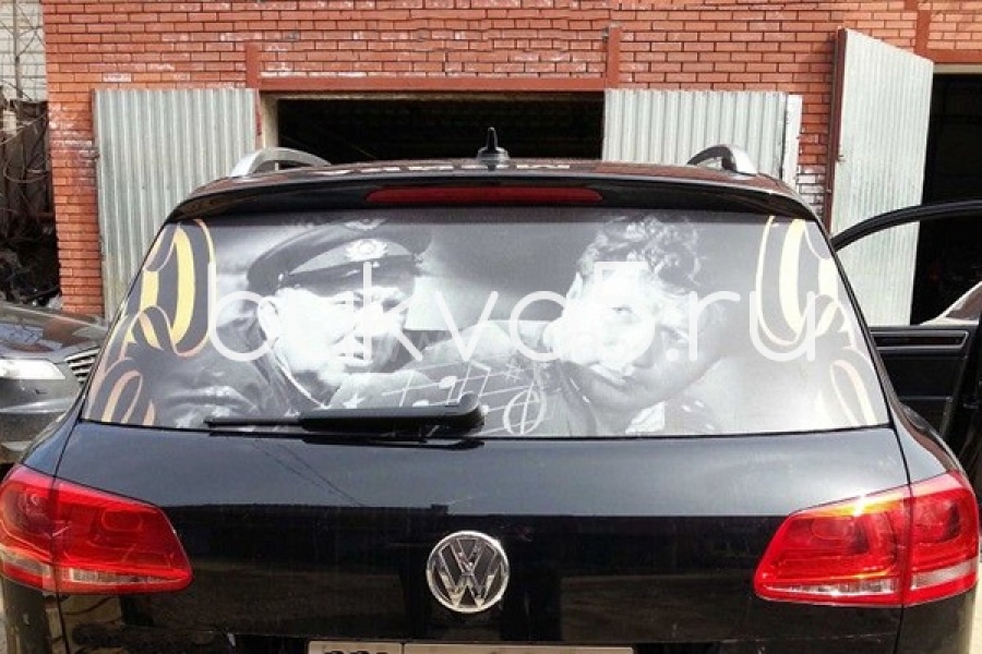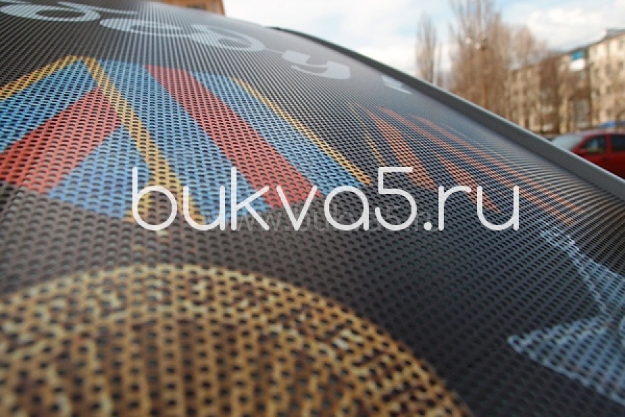 Печать на перфорированной белой пленке. Изображение видно снаружи, а изнутри только эффект тонировки. Применяются для оклейки заднего стекла автомобиля.