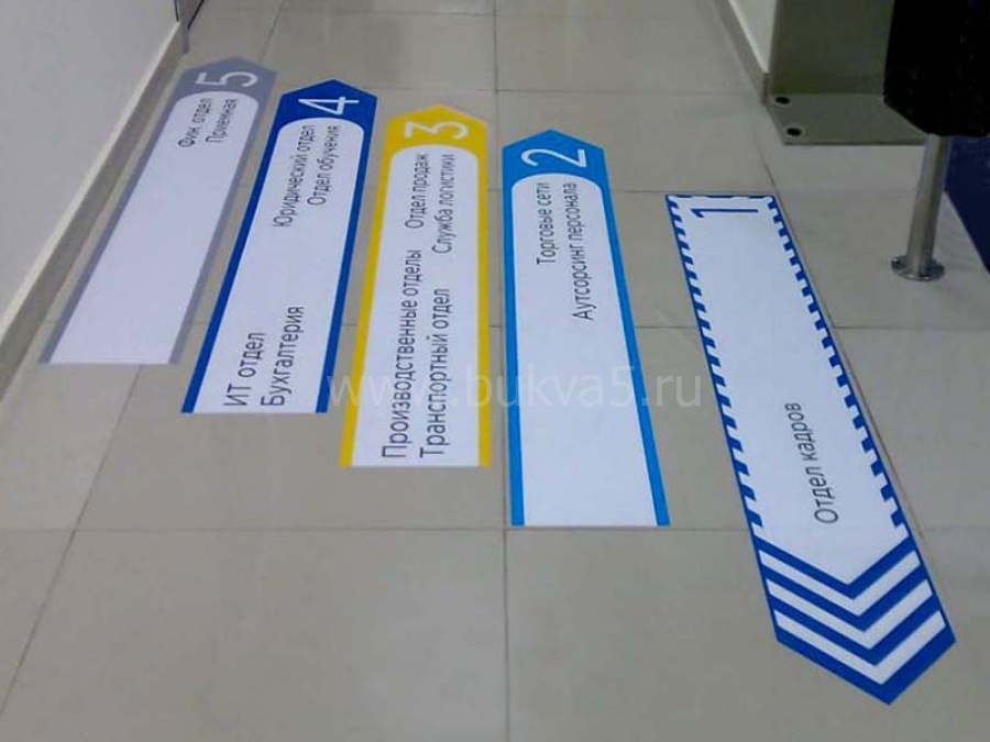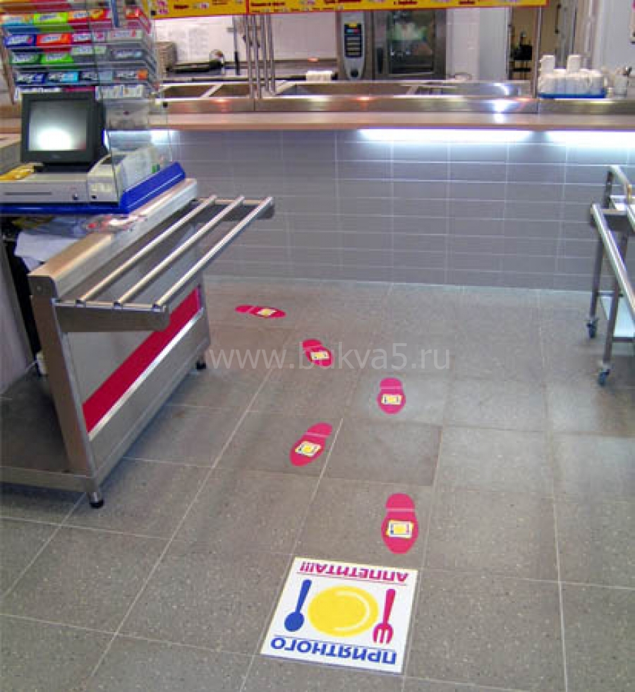 - Специальные информационные наклейки для пола. Они изготавливаются из толстой самоклеящейся пленки со слоем износостойкой навигации, наклейка имеет эффект антискольжения. Цветная цифровая печать и фигурная резка позволяют реализовать креативный замысел. Наклейка наносится на ровные гладкие поверхности. Популярный вариант — изображения в форме ступней.