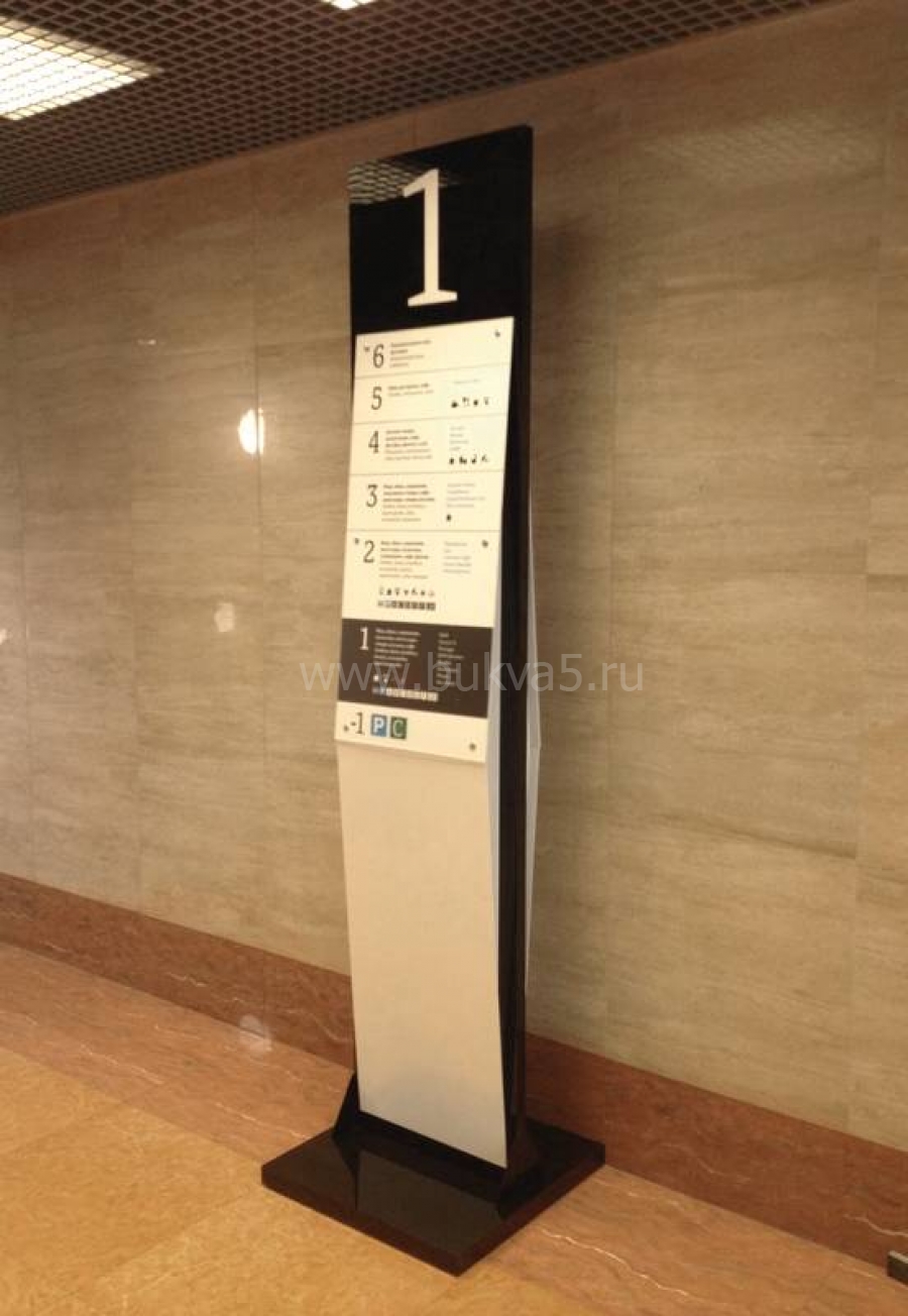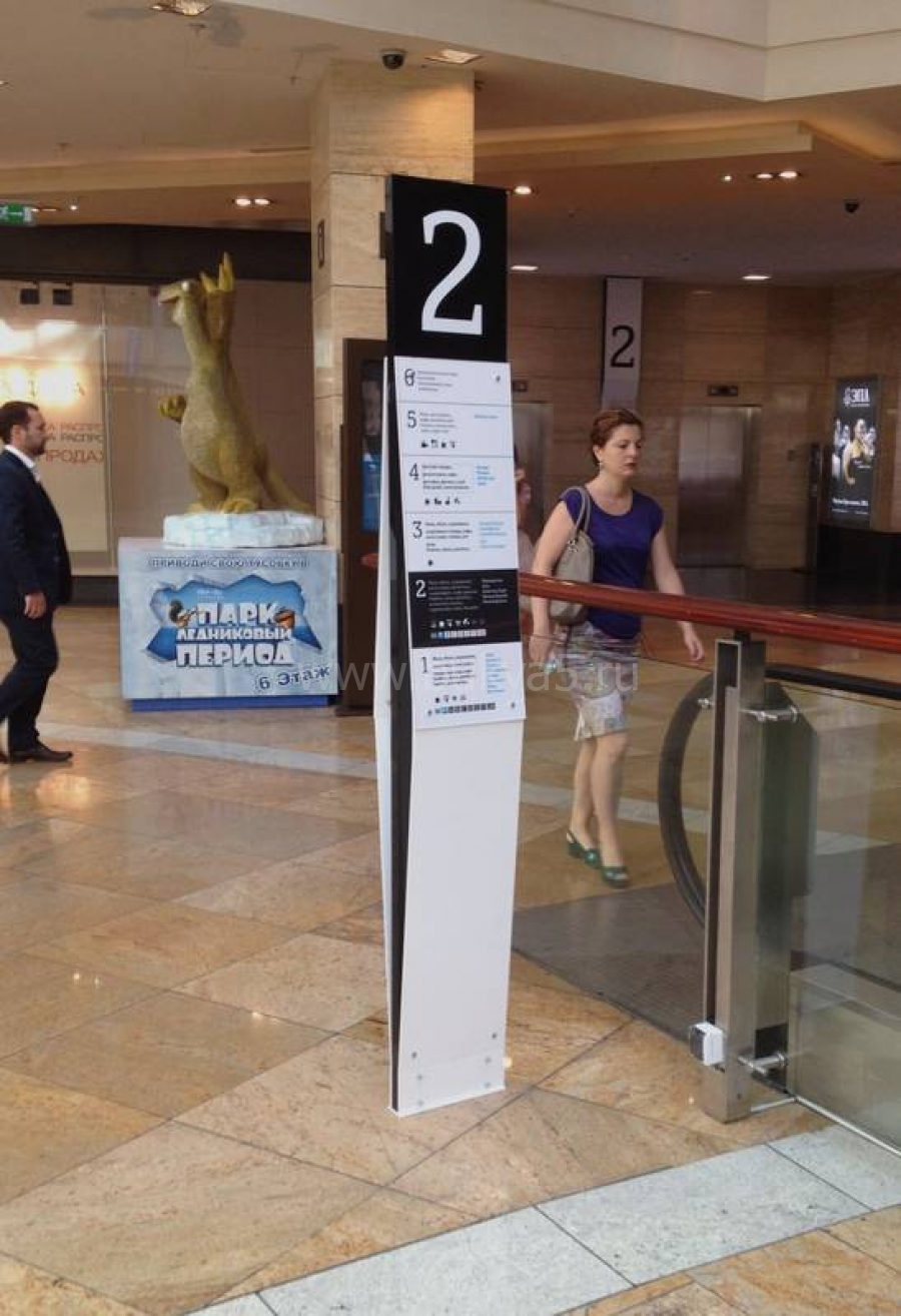 - Разнообразные таблички на подставках, указатели на стойках, стелы сложной конфигурации, световые пилоны. Такие конструкции привлекают внимание издалека, напольные стойки навигации информирую о расположении отделов, предлагаемых товарах и выгодных акциях.