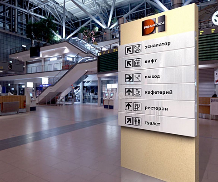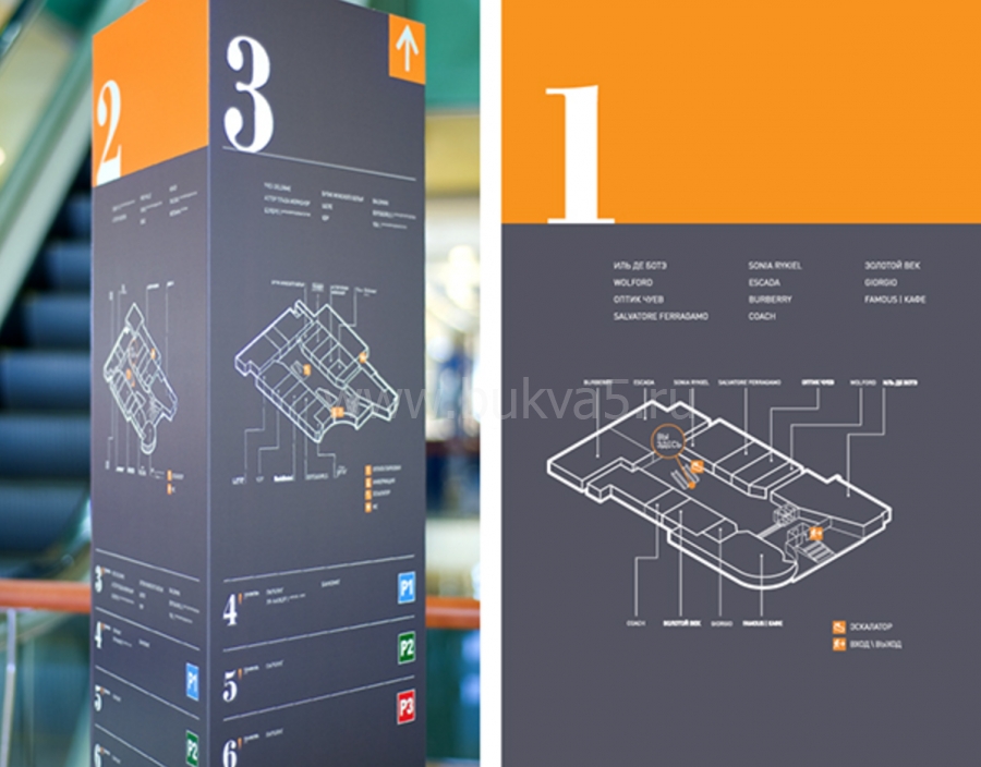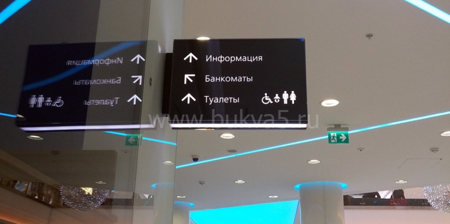 - 2. Внутренние указатели. Они помогают найти лестницы, эскалаторы, переходы, фуд-корт, лифты, вход в подземный паркинг.