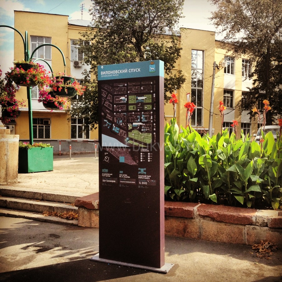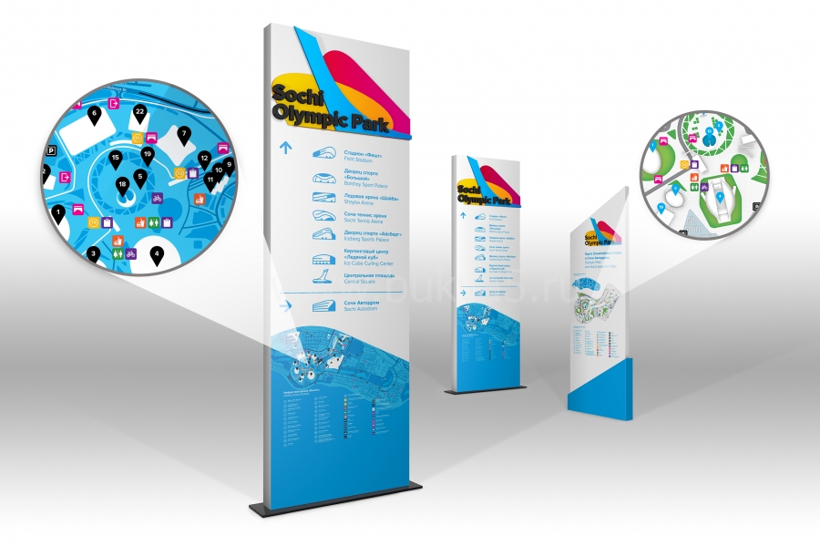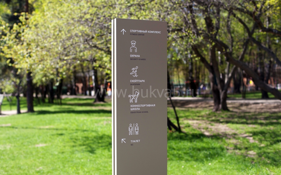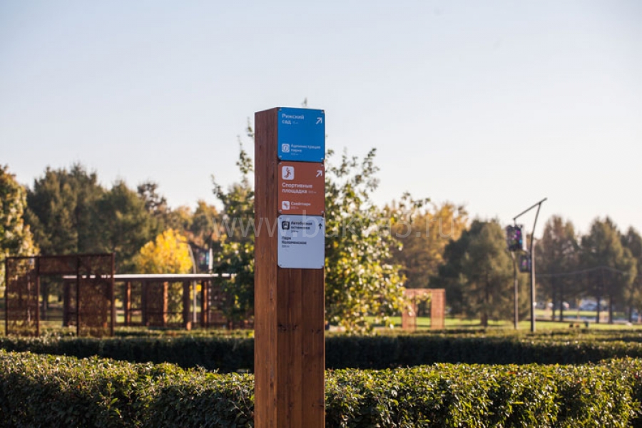 - 3. Стелы с указанием направления движения — вход/выход, туалеты, основные места, которые стоит посетить.
