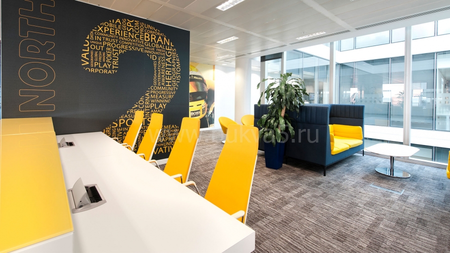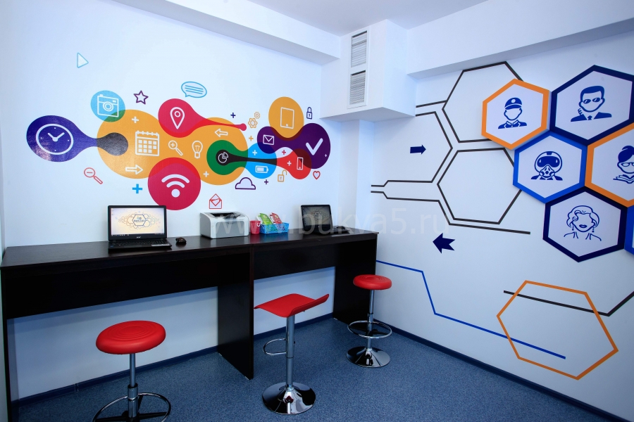 Стандартное и праздничное оформление офисов подразумевает использование креативной рекламы, оригинальных художественных элементов, современных фотообоев и др. При этом особое внимание уделяется дизайну следующих зон: