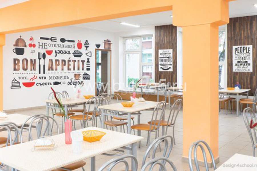 Мы поможем воплотить в жизнь любой новаторский проект современного дизайна школьной столовой. Для реализации креативных идей используется интерьерный пластик, виниловая самоклеящаяся пленка с полноцветной печатью, баннерная ткань и другие современные материалы. Принты наносятся с помощью безопасных красок, не имеющих резкого запаха.