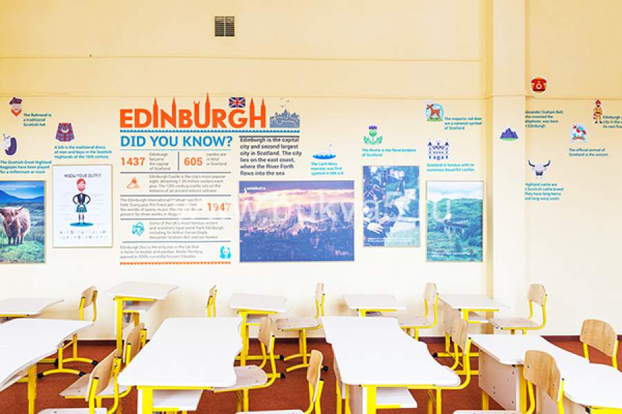 Для оформления стен могут использоваться мотивационные, учебные, исторические и обучающие сюжеты.