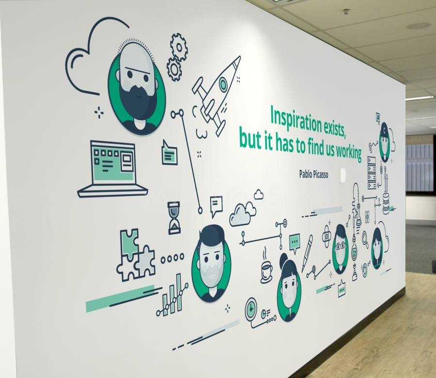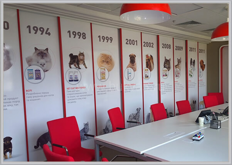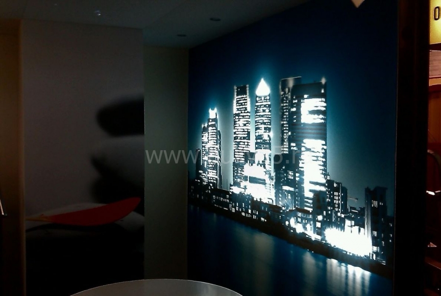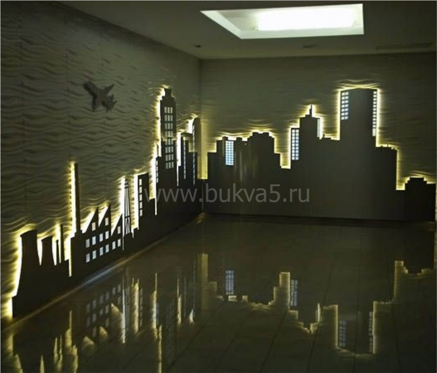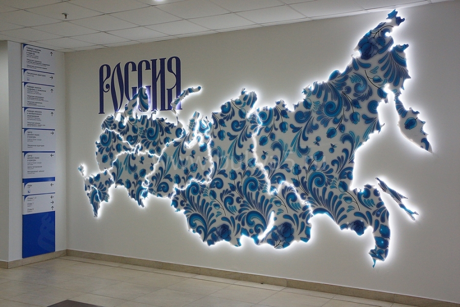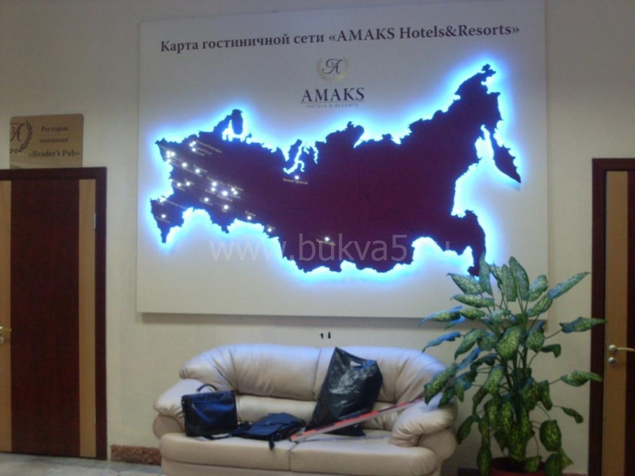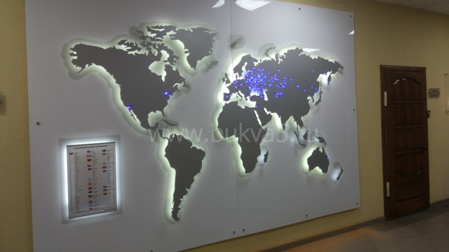 - 2. Фигурные изображения. К таким элементам интерьера относятся карты, фирменные логотипы, декоративные картины. Как и крупноформатные панно, эти изделия выполняют одновременно несколько задач: маркетинговую, эстетическую, мотивационную, информационную. Некоторые образцы оснащаются энергоэффективными источниками света для их лучшей видимости при недостаточной освещенности.