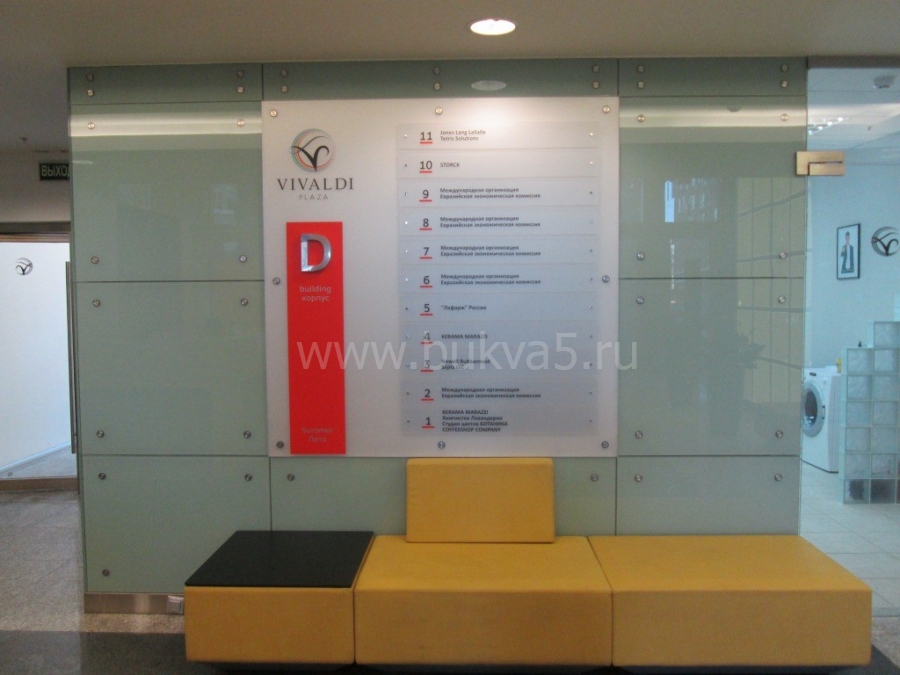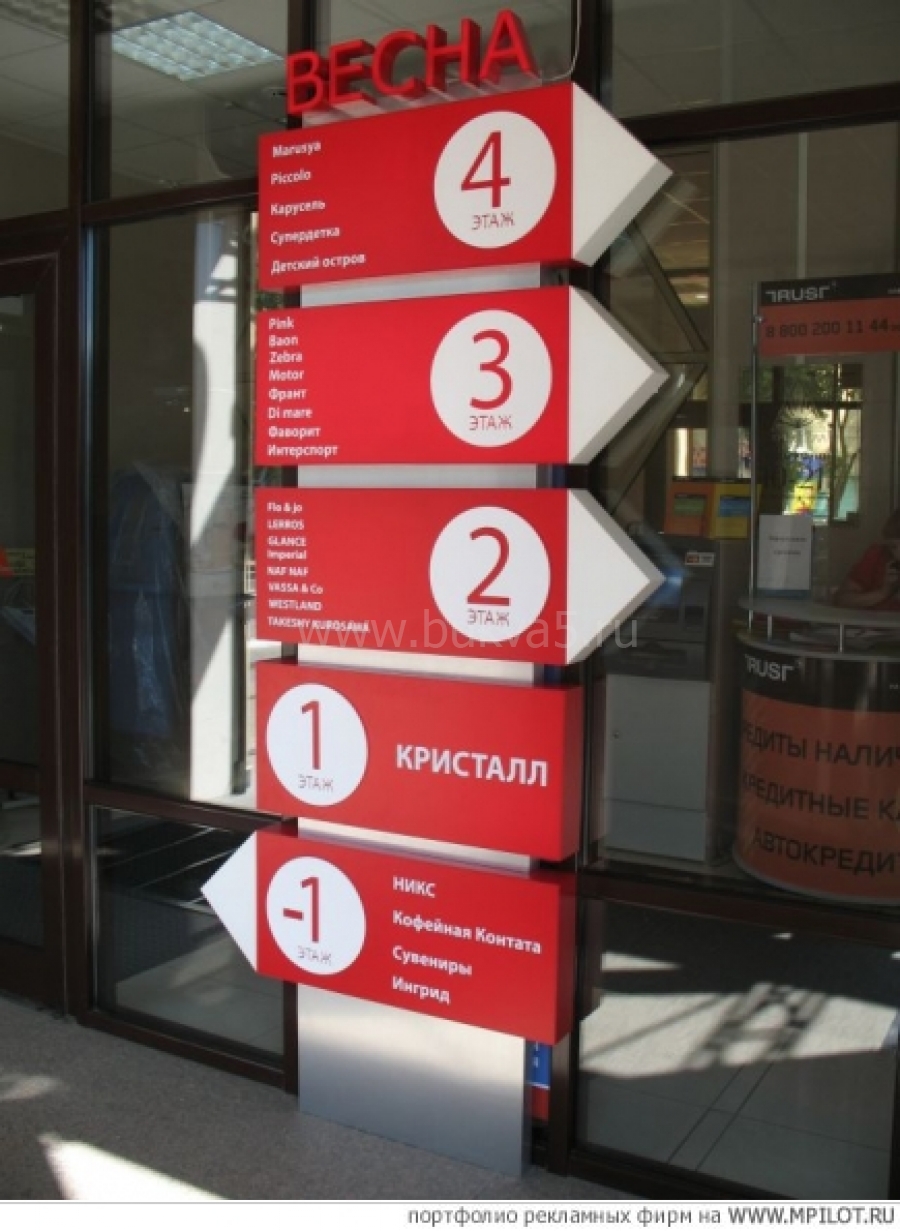 Компания «Буква 5» занимается изготовлением на заказ рекламной навигации для магазинов, торговых и бизнес-центров, офисов в Москве. Информационные таблички, указатели и другие навигационные элементы помогают клиентам быстрее сориентироваться в помещении, найти нужный отдел или торговую точку. Мы предлагаем заказать производство и размещение системы наружной и внутренней навигации с оригинальным дизайном в корпоративном стиле.