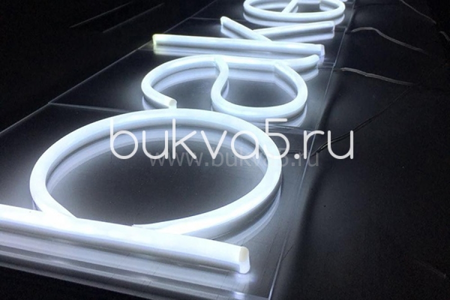 Контражурная светодиодная подсветка надписи. Светодиоды размещены с тыльной стороны изделия, свет от них падает на стену или подложку, отражаясь, создает световой ореол по контору.