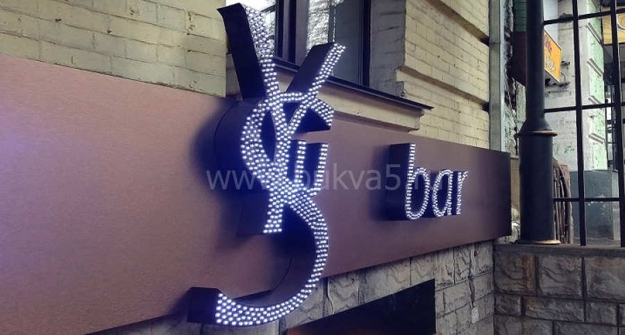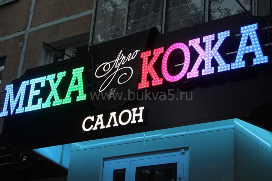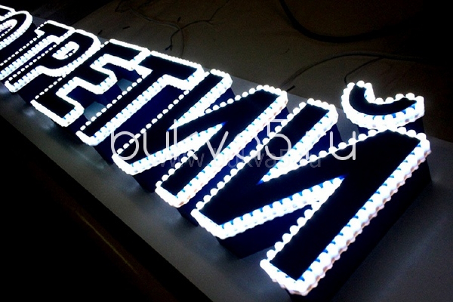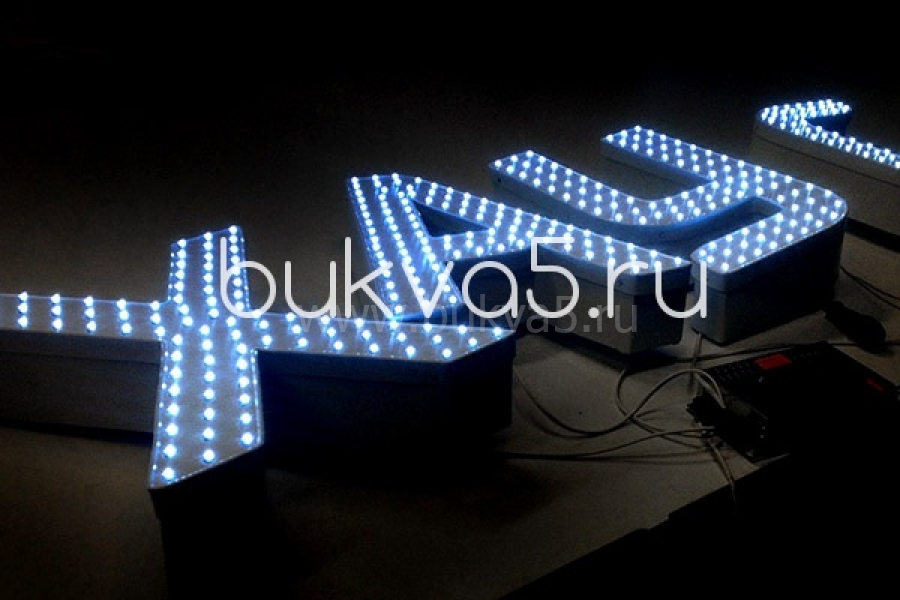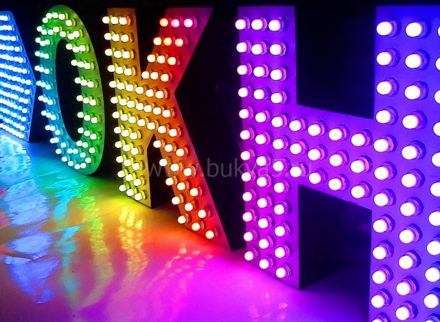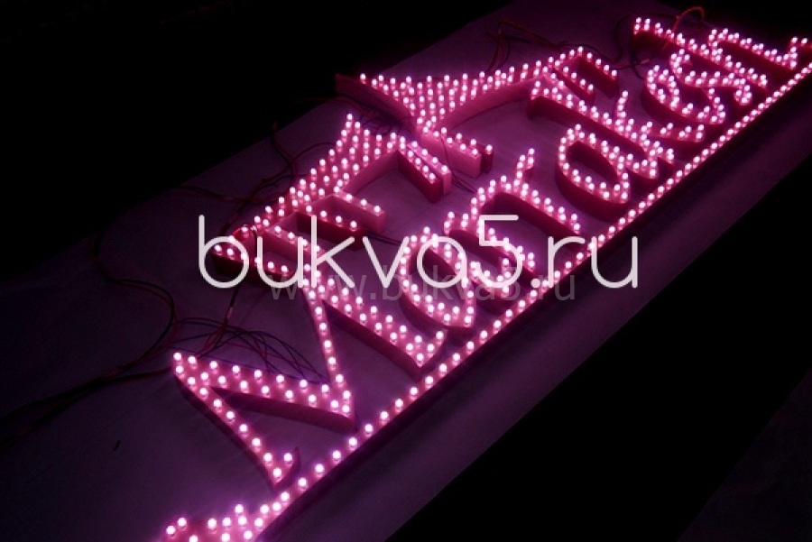 Надписи, украшенные открытыми светодиодами на лицевой стороне. Это может как точечные или контурные варианты подсветки, так и лицо, полностью замощенное диодами.