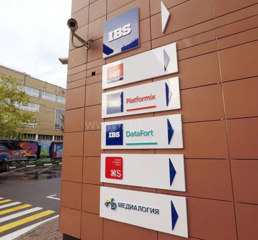 - 2. Адресные таблички, помогающие найти путь к нужному строению на территории. Наружная навигация повышает имидж компании в глазах клиента — посетитель по достоинству оценит заботу.